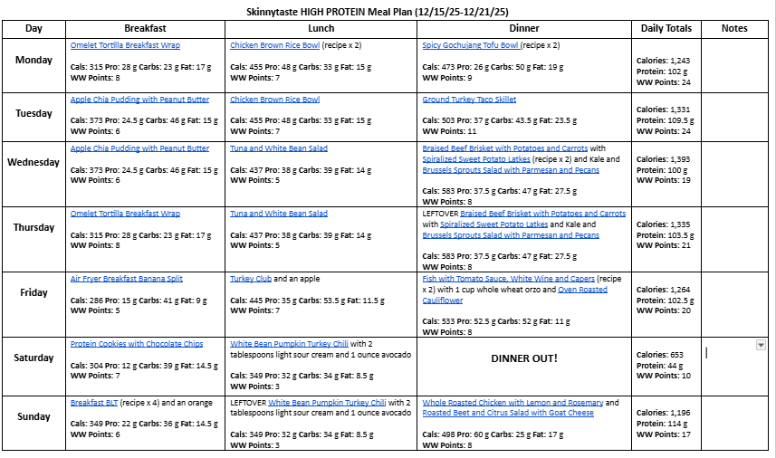 A free, 7-day high protein diet meal plan including breakfast, lunch and dinner ideas and a shopping list. All recipes include macros and Weight Watchers points.