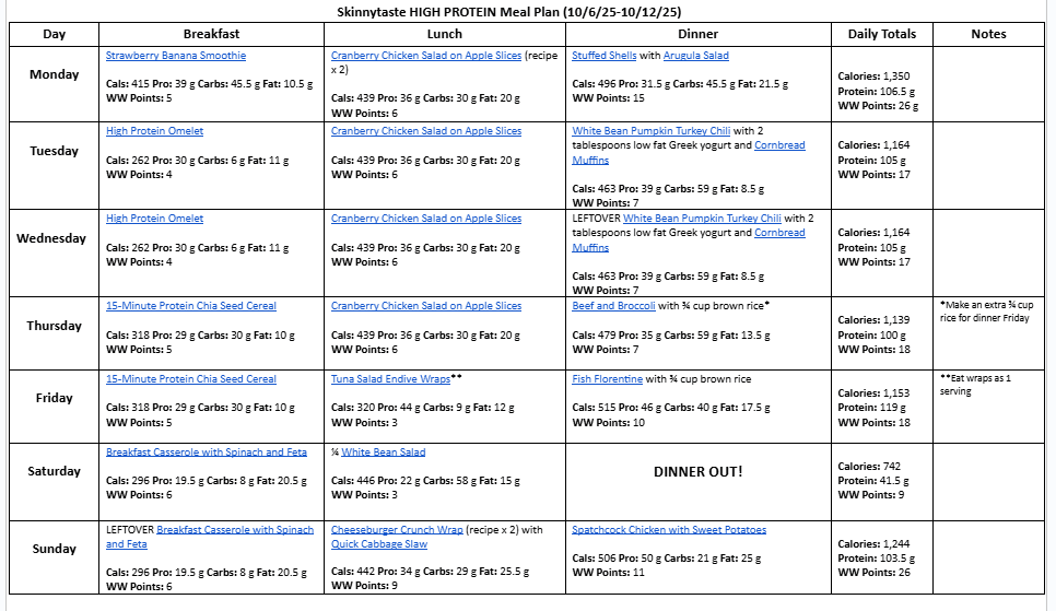 A free, 7-day high protein diet meal plan including breakfast, lunch and dinner ideas and a shopping list. All recipes include macros and Weight Watchers points.