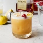 This amaretto sour cocktail is frothy, nutty, and bright. Easy to make with 5 ingredients, it’s one of our favorite cocktails to make during the holiday season and throughout the winter.