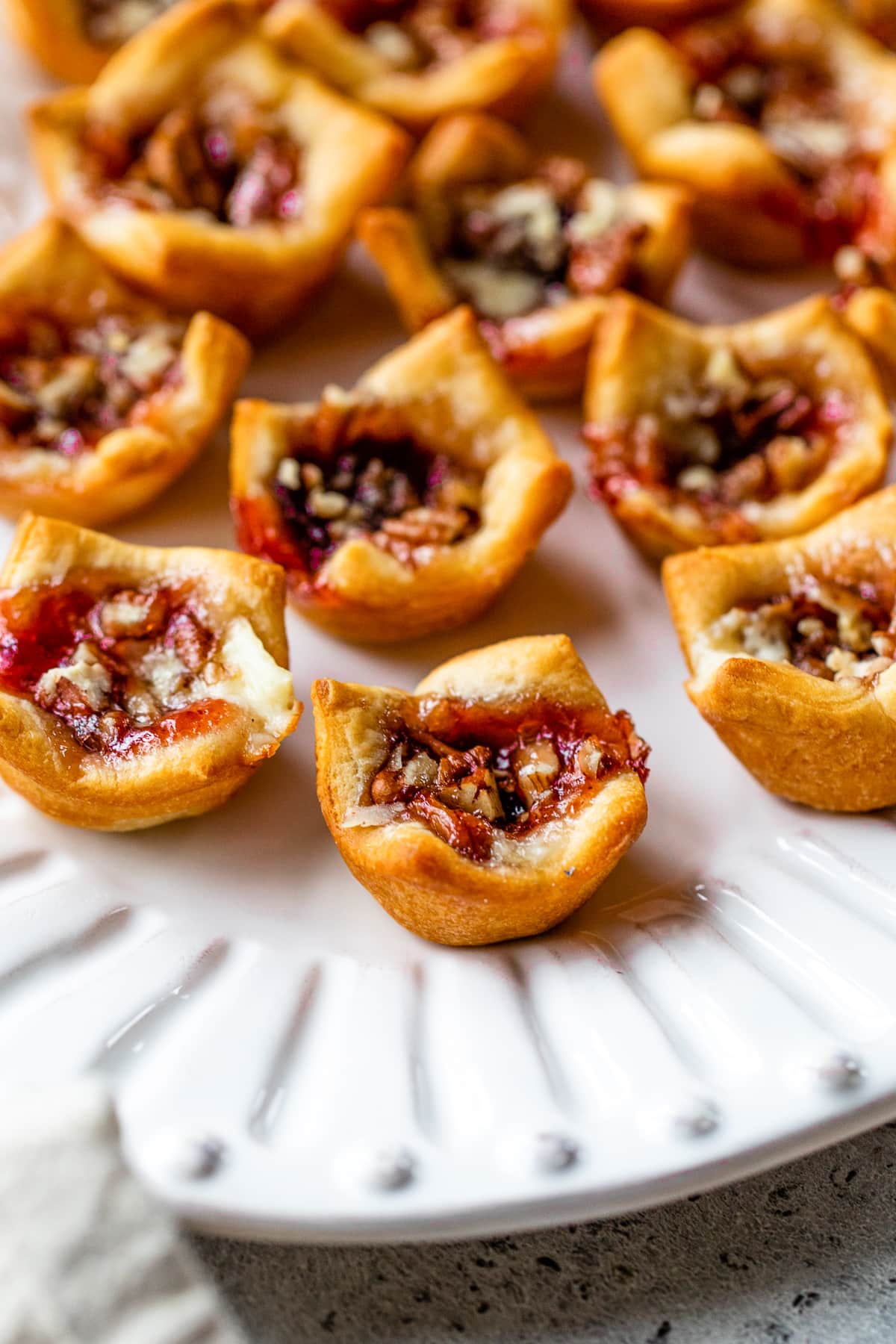 Warm, gooey baked brie bites wrapped in golden crescent dough with a touch of sugar-plum jam (or any jam you like)… the easiest holiday bite that feels so special.