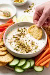 • Right before the party: Garnish it with hot honey, pistachios, and red pepper flakes. Set out the crackers and vegetables to serve with it.
